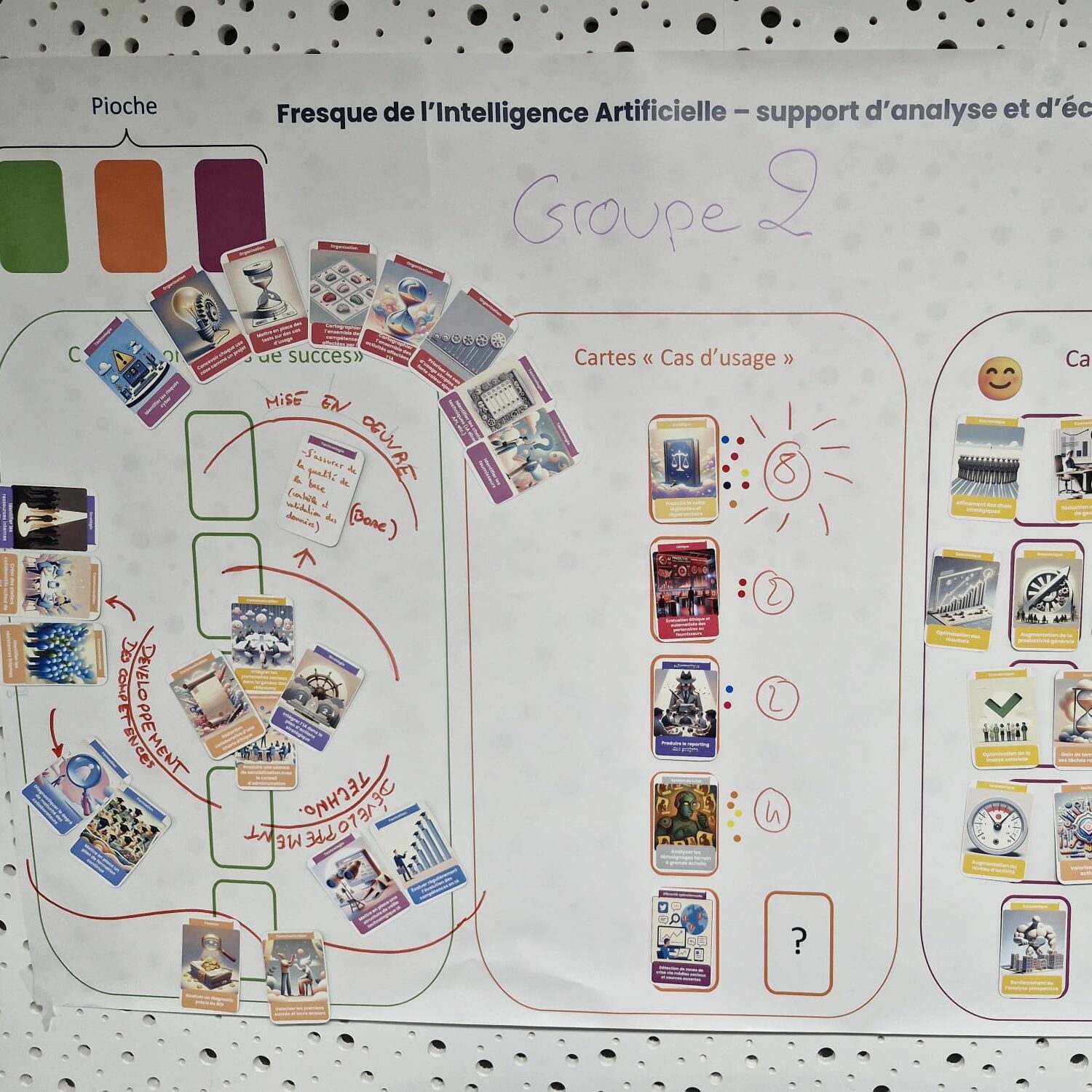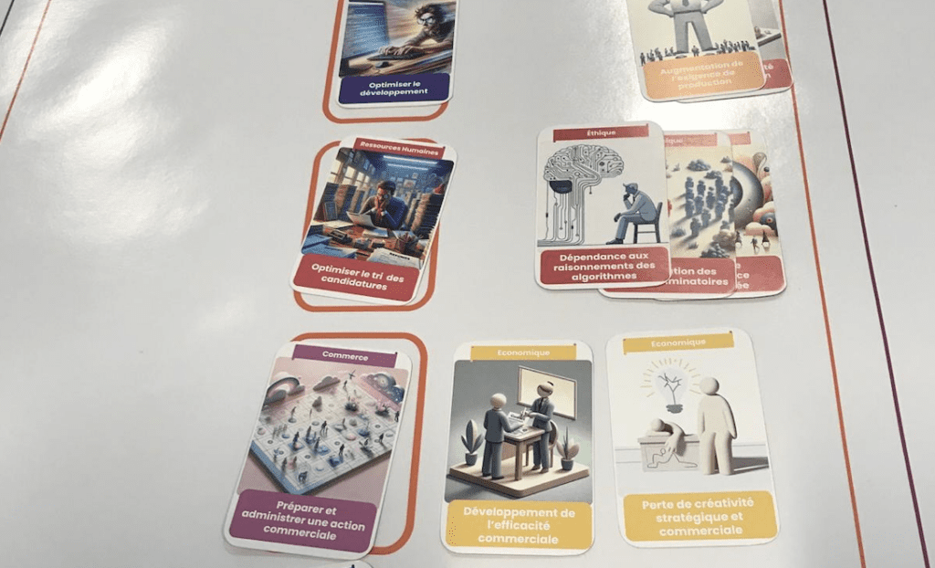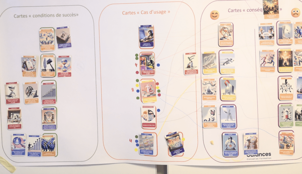 En sous-groupe d’environ 8 personnes, les participants créent La Fresque de l’IA® à partir de 3 jeux de cartes personnalisés (Cas d’usage, conséquences et conditions de succès)